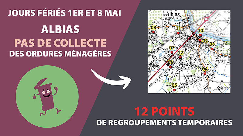 Vendredi 1er mai et vendredi 8 mai 2020, la collecte des ordures ménagères (bacs grenat) ne s’effectuera pas en porte à porte sur la commune d’Albias....