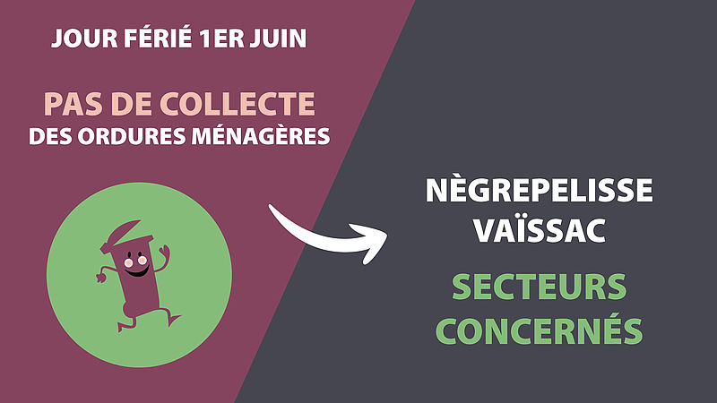 Lundi 1er juin, jour férié, la collecte des ordures ménagères ne sera pas assurée sur les secteurs suivants :