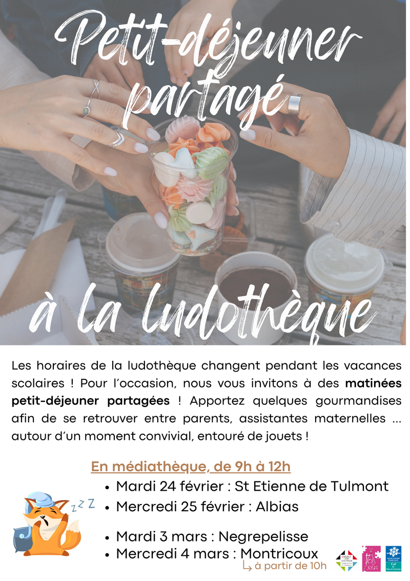 Quatre dates pendant les vacances de février. La Ludothèque Tipi de jeux propose des petits-déjeuners partagés, dans vos médiathèques. De 9h à 12h.