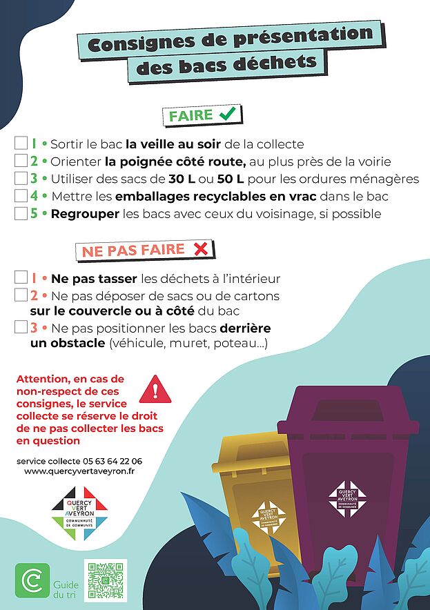 Comment présenter les bacs d'ordures ménagères ?Attention, en cas de non-respect de ces consignes, le Service Déchets se réserve le droit de ne pas collecter les bacs ordures ménagères. Pour plus d’information se reporter au Règlement de collecte des déchets.