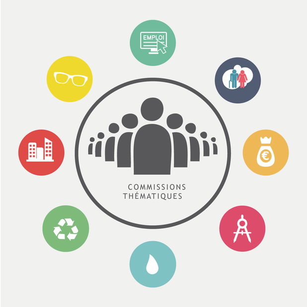 Les commissions thématiques correspondent à une ou plusieurs compétences de la Communauté. Le Président et ses Vice-Présidents / Conseiller Délégué ont en charge une commission thématique définie par le conseil communautaire.
